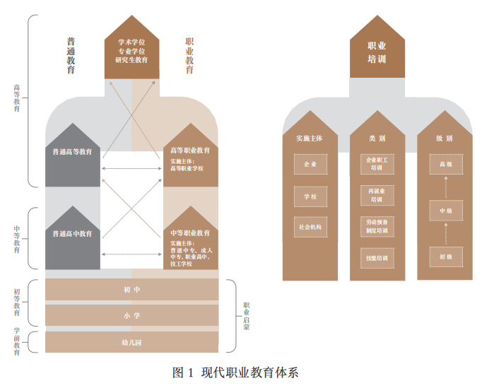 近年来,中国职业教育主动适应经济社会发展需要,落实职业学校教育和职业培训并重,促进职业教育与普通教育横向融通,推进不同层次职业教育纵向贯通,加快建设服务全民终身学习的现代职业教育体系(图1)。职业学校教育包括职业启蒙教育、中等职业学校教育、高等职业学校教育等阶段。职业培训包括技能培训、劳动预备制培训、再就业培训和企业职工培训等类别,依据职业技能标准,培训分为初级、中级、高级职业培训和其他适应性培训,企业、学校、社会机构等均可开展职业培训。