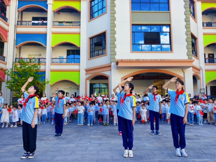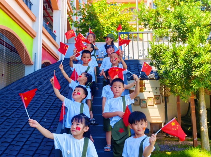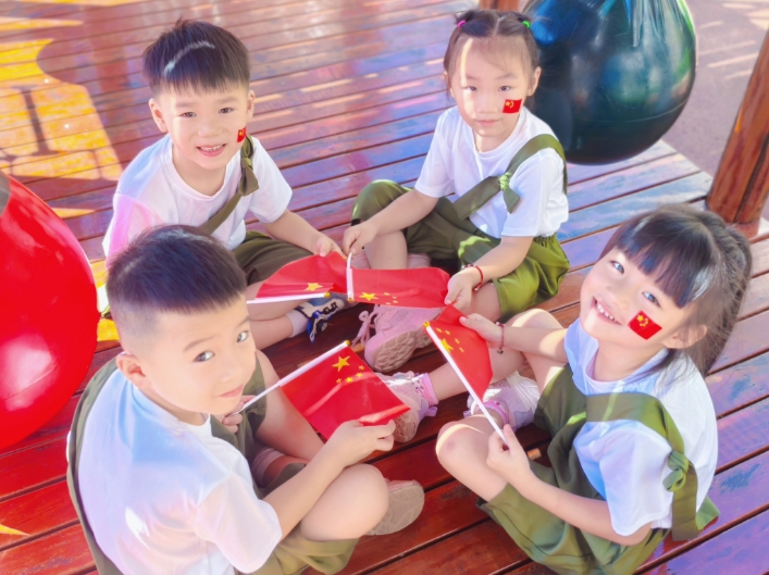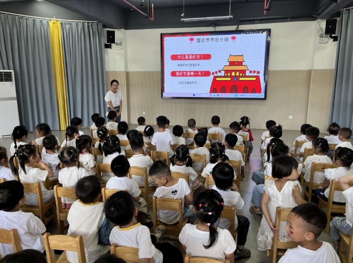 班级环境创设中,孩子们和老师一起整理大棚、学唱歌曲;小班组在三楼多功能厅开展了“中秋故事 我给祖国送祝?!被疃?;全体师生在操场集中举行了庄严的升旗仪式;全园还开展了红色教育活动,一颗颗爱国的种子在孩子们心中生根发芽。中班组开展了“小小巧手迎国庆”活动,孩子们在各班教室尽情发挥创意。